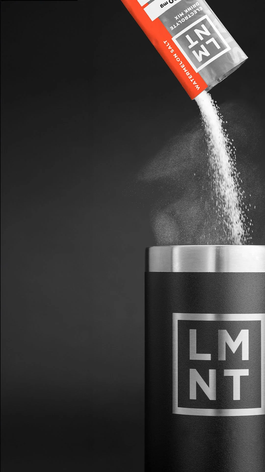 A packet labeled LMNT salt is pouring salt into a black and silver insulated container with an LMNT logo against a dark background.