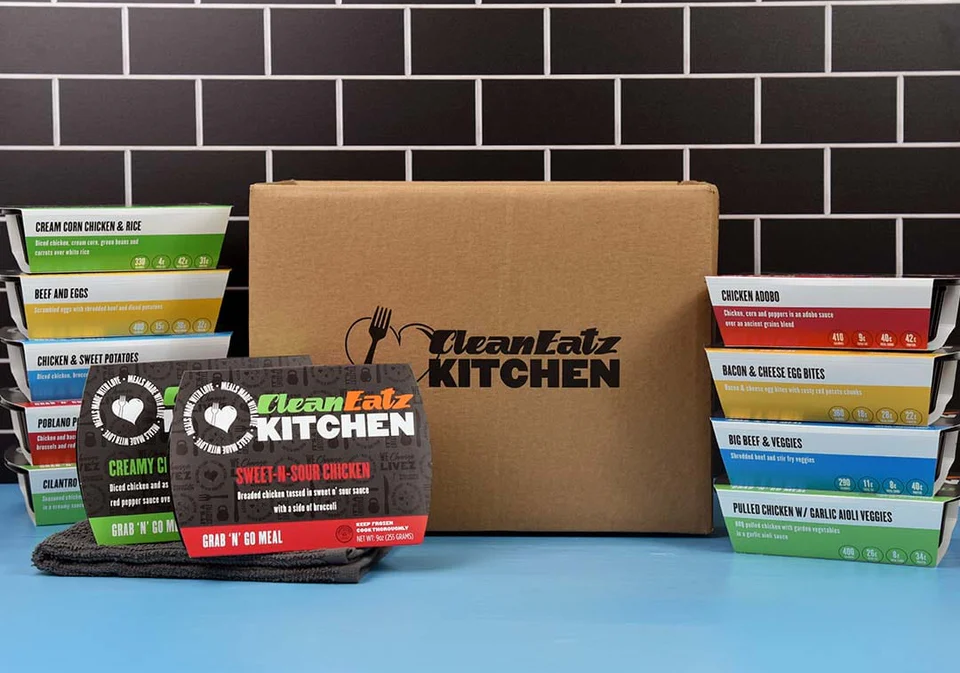 Assorted meal kits and snacks from Clean Eatz Kitchen, including chicken, beef, and vegetarian options, displayed with a brown box and colorful packaging on a blue surface against a black brick wall.